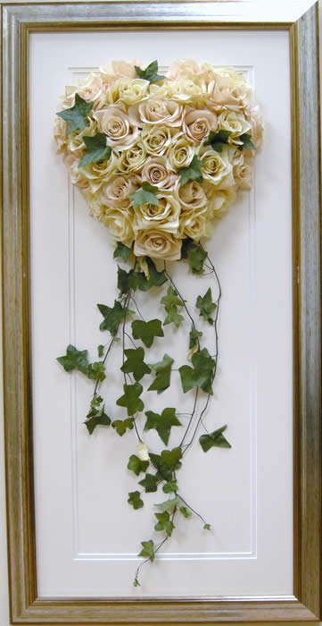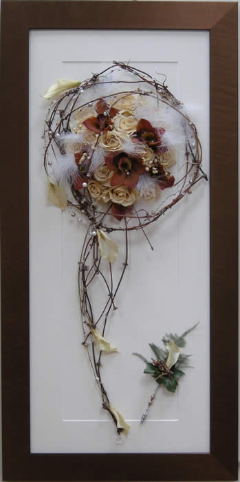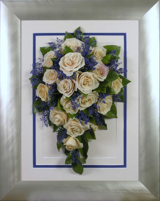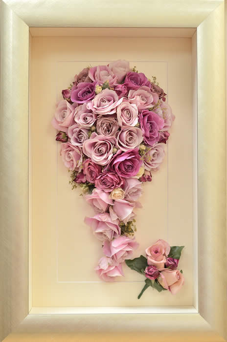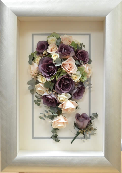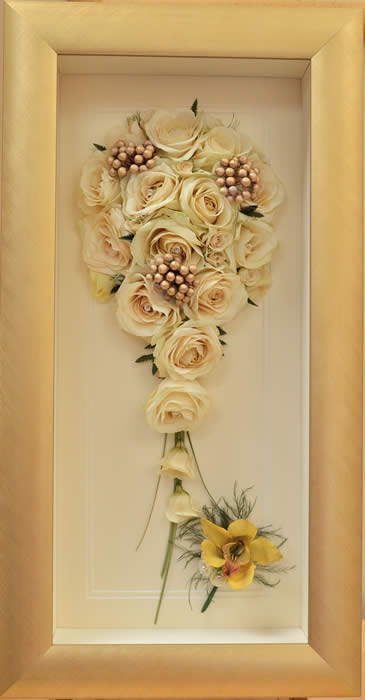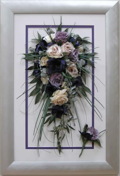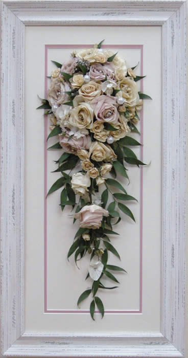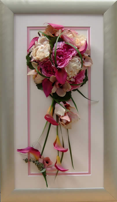 Please see below some examples of trailing bouquets that we have preserved at Precious Petals.All our frames are hand made to fit our customers flowers by our expert framer and glazed with conservation glass. We do not charge extra to include buttonholes, photographs or invitations in the display.