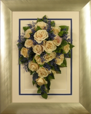 Mrs Humes beautiful bouquet of cream roses. She chose our pewter frame to display her flowers in with a double cream mount.